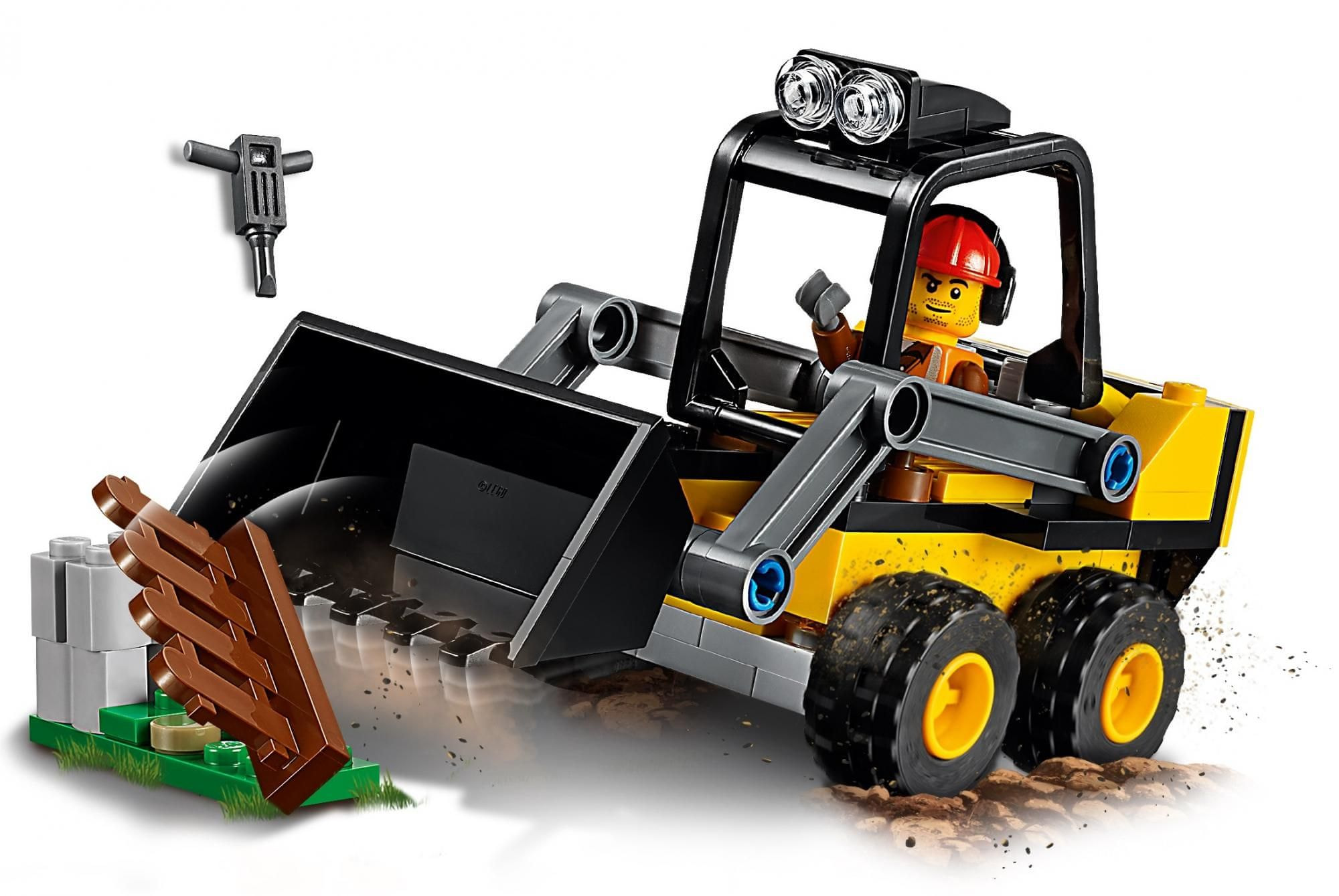 Stavite kacigu i brzo na posao! Povucite ogradu s poda s utovarivačem. Uhvatite čekić, razbijte beton i uklonite nered s pomoću prednjeg utovarivača. LEGO® City radnici danas imaju puno posla!
