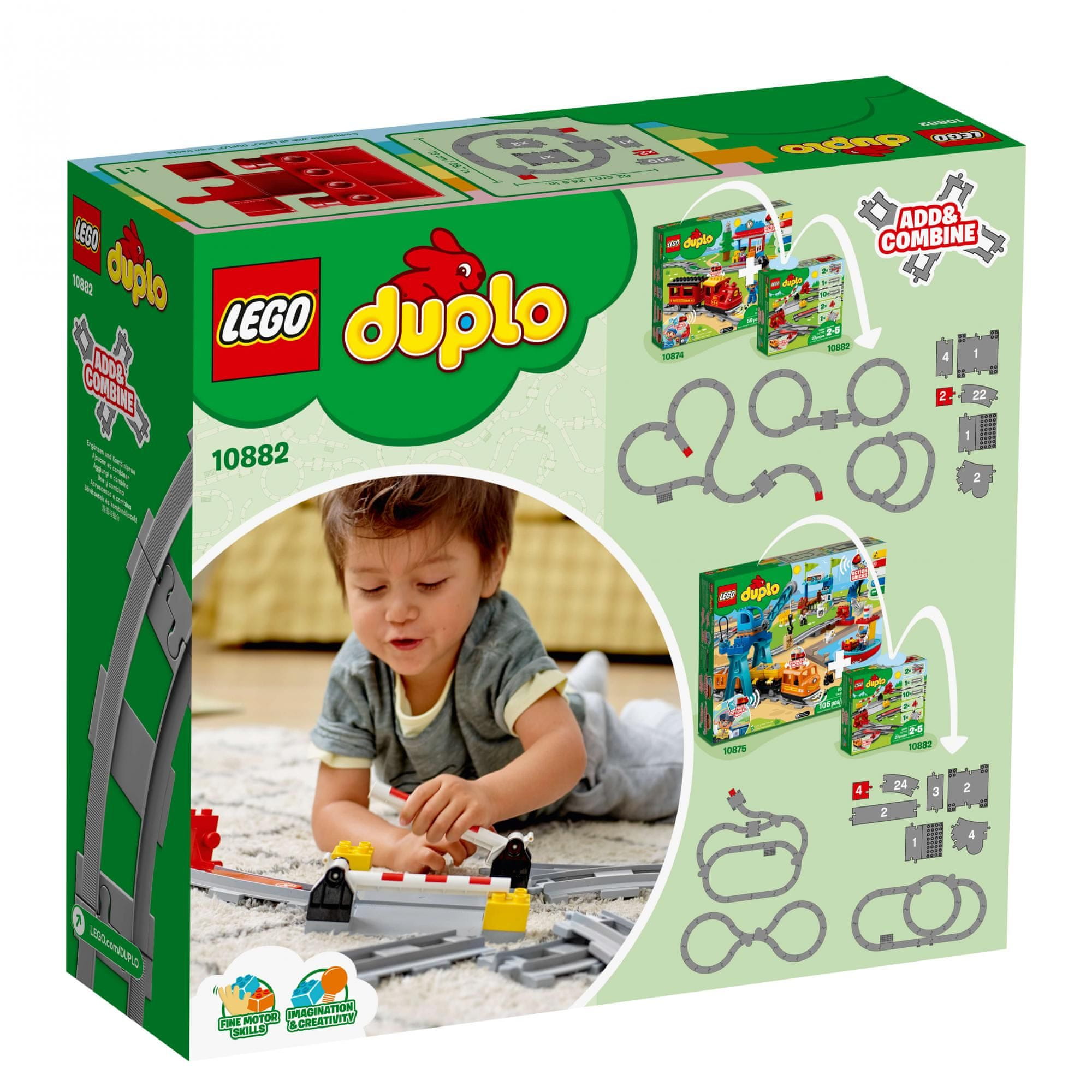 Otvorite vrata beskonačnim mogućnostima i sa svojim najmlađim postavite odličnu željezničku prugu za novi ili postojeći DUPLO vlak s kompletom 10882 Tračnice od LEGO® DUPLO®. Zahvaljujući željezničkom križanju, postajama, mogućnosti isključivanja i kombinaciji zakrivljenih i ravnih staza, komplet donosi puno zabave!