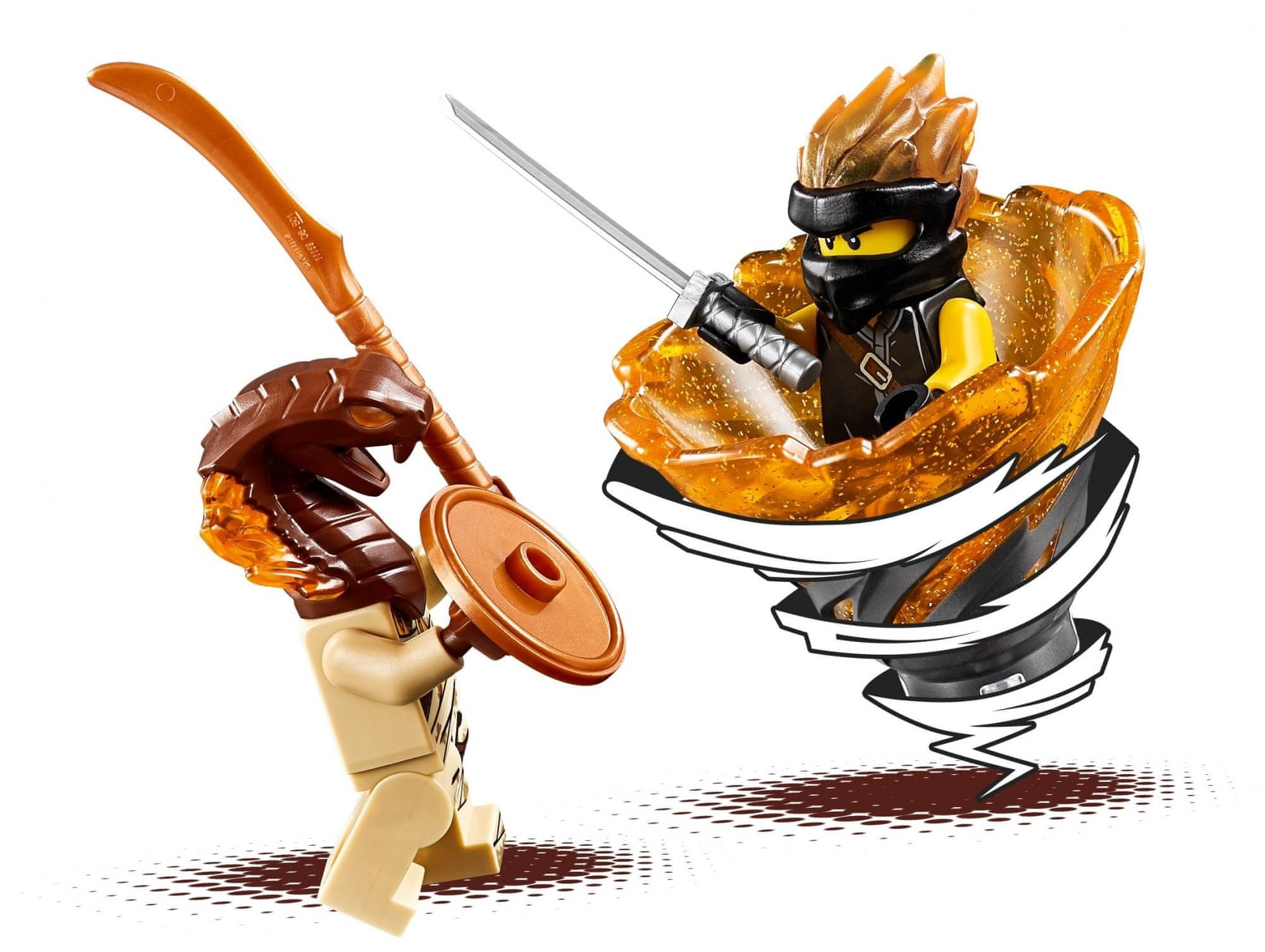 Među oružjem naći ćete Kaijevu srebrnu i zlatnu katanu, Jayevu srebrnu katanu i zlatne nunčake, Nyinu srebrnu katanu i zlatno koplje, Wujev štap, Charovo žezlo, Pyro mač i Pyro sablju. Među dodacima za Kaia, Jaya i Nyu možete naći i „powered-up“ pokrov i Tornad lemilicu Cole FS, kaput Wuje, Aspheerin Scroll of Forbidden Spinjitzu, Aspheerin i Pyro Destroyerov zmijski oklop i štit i Pyro Slayerov štit. Ninja vozilo mjeri više od 22 cm u visinu, 50 cm u dužinu i 18 cm u širinu.