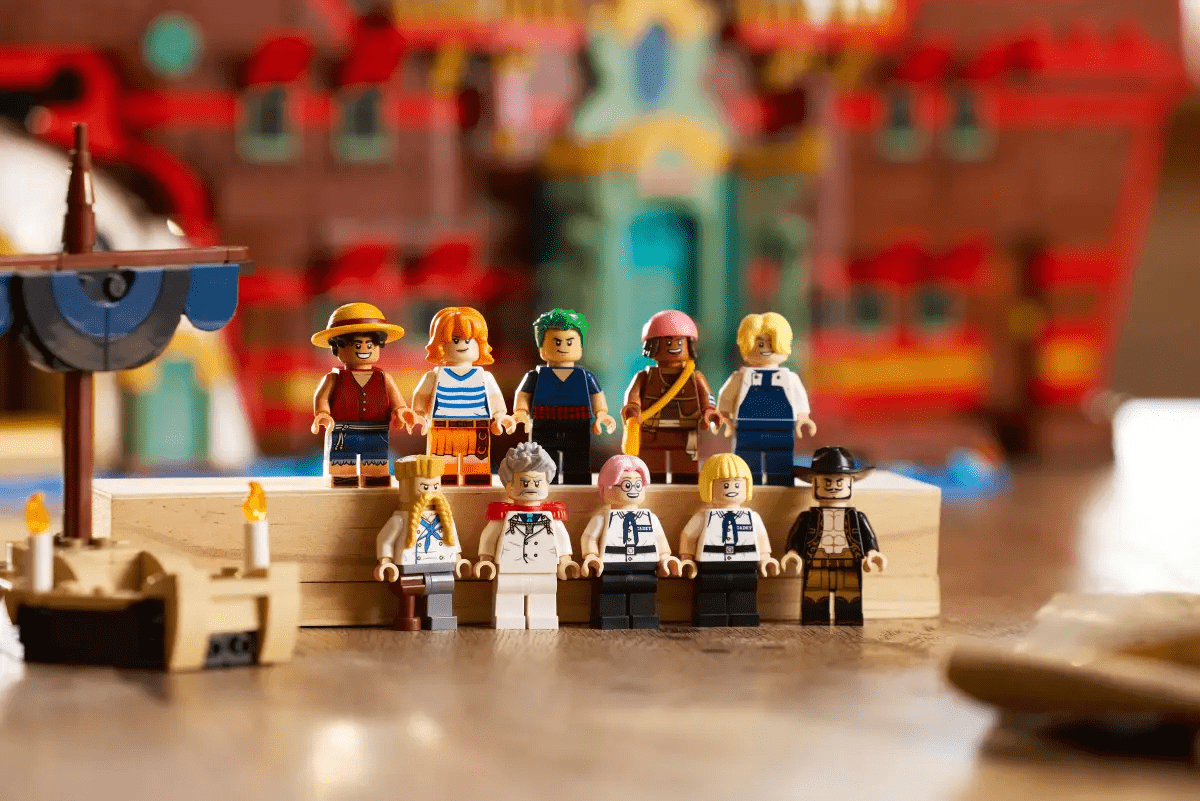 - 10 LEGO® anime minifigura – Luffy, Zoro, Nami, Usopp, Sanji, Zeff, Garp, Helmeppo, Koby i Mihawk.