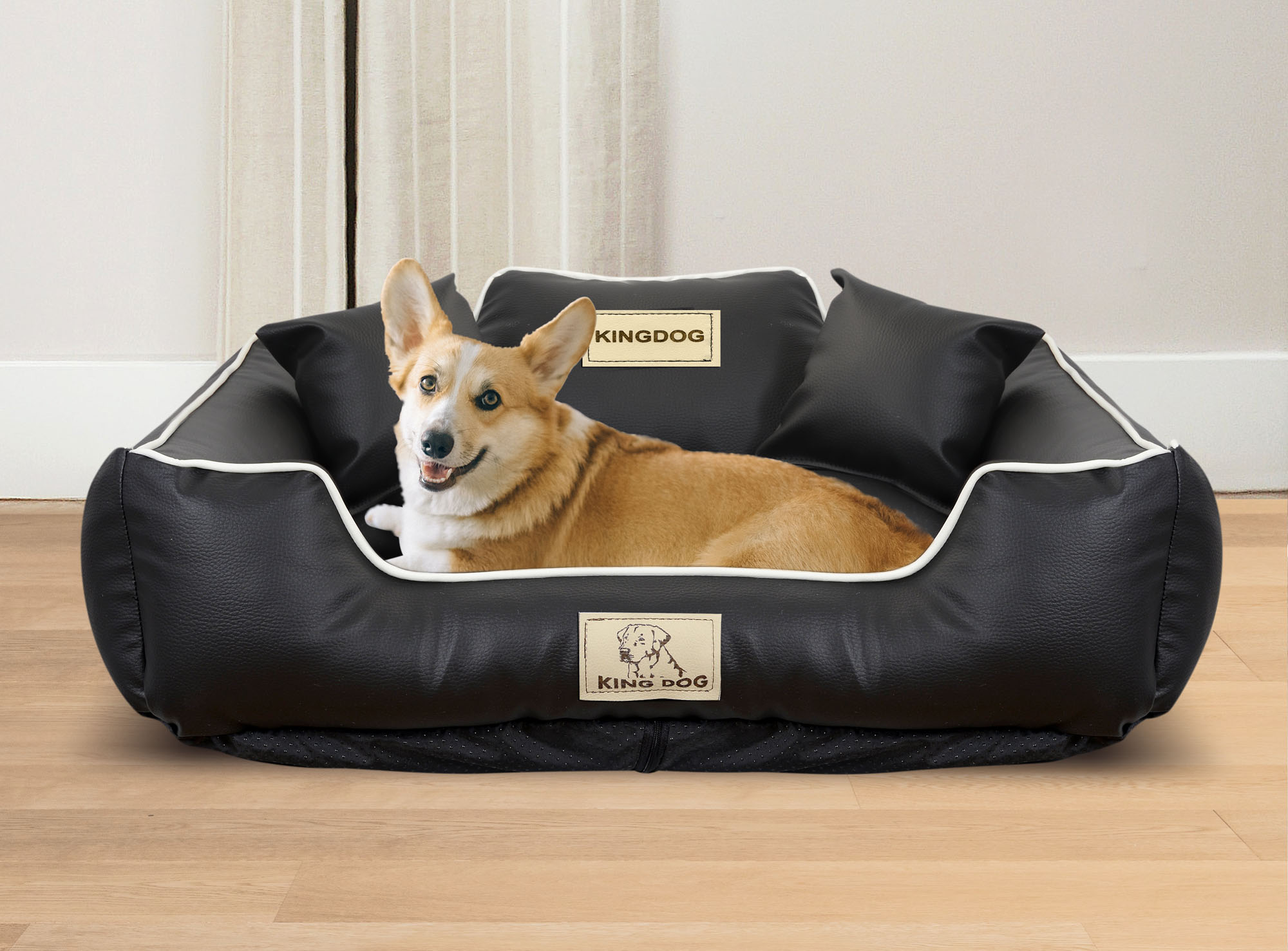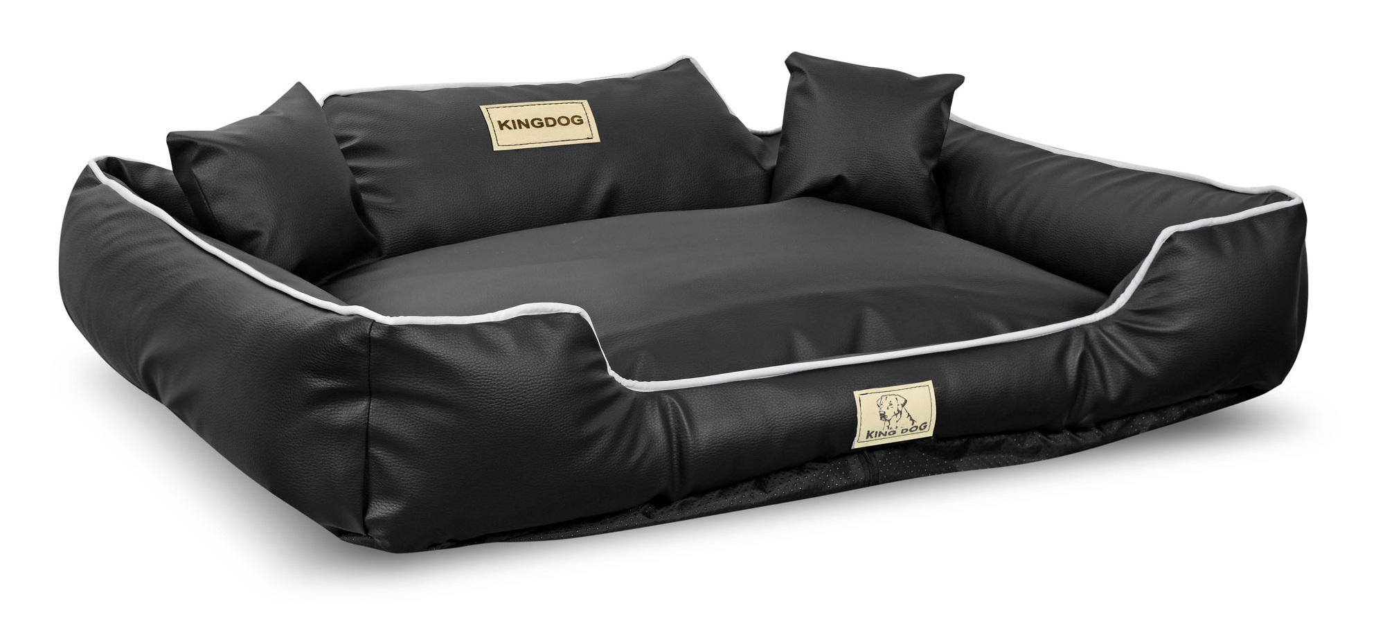 Izdelano iz EKO USNJA, SNEMLJIVO iz zadrga, protizdrsna pasja postelja KINGDOG u crni boji s belim workom, PERSONALIZIRANO s imenom vašeg ljubljenčka!