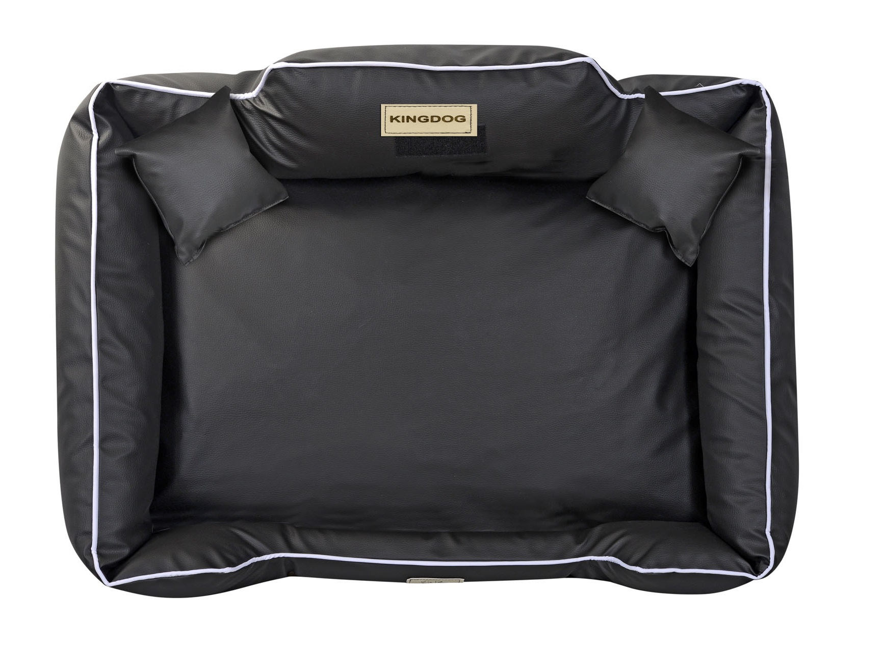 Izdelano iz EKO USNJA, SNEMLJIVO iz zadrga, protizdrsna pasja postelja KINGDOG u crni boji s belim workom, PERSONALIZIRANO s imenom vašeg ljubljenčka.