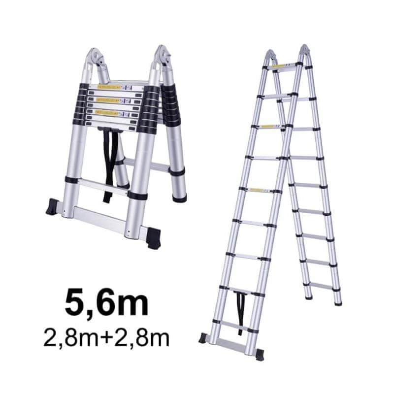 Teleskopske ljestve 2u1 s maksimalnom duljinom od 5,6 m idealne su za dom i profesionalnu uporabu. Lako se prenose, kompaktne su i izdržljive, savršene za svaki zadatak od vrtlarenja do dosezanja visokih polica.