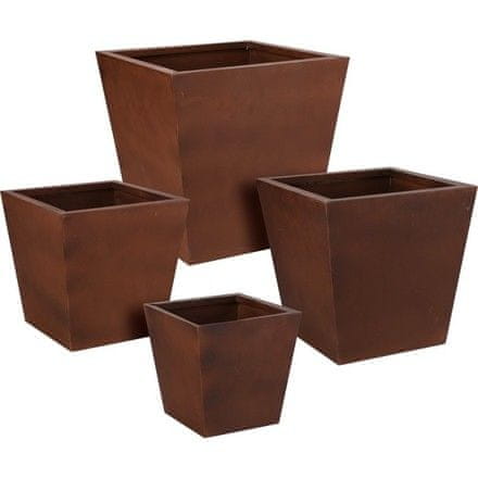 - set od 4 cvjetne posude koje se mogu postaviti na otvorenom i u zatvorenom prostoru – izrađene od metala – dizajn hrđave površine – set uključuje 4 cvjetne posude različitih veličina: – 40 × 40 cm – 35 × 35 cm – 30 × 30 cm – 25 × 25 cm