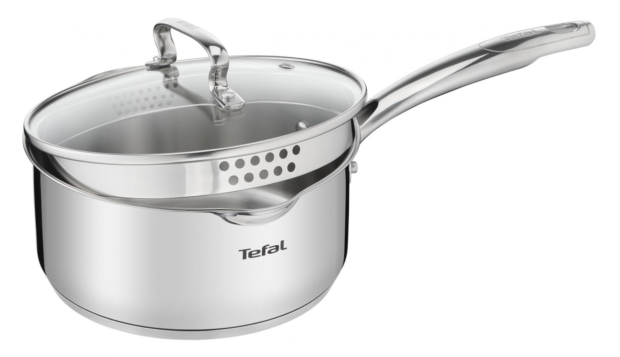 Lonac Duetto+ marke Tefal štedi vrijeme u kuhinji. Dolazi s praktičnim poklopcem na cjedilo, koji na jednoj strani ima rupe za prosijavanje tjestenine, a na drugoj strani za sijanje riže. Posude su kompatibilne sa svim vrstama ploča za kuhanje, uključujući indukciju, a mogu se peći i u pećnici. Perilica za suđe za pranje.