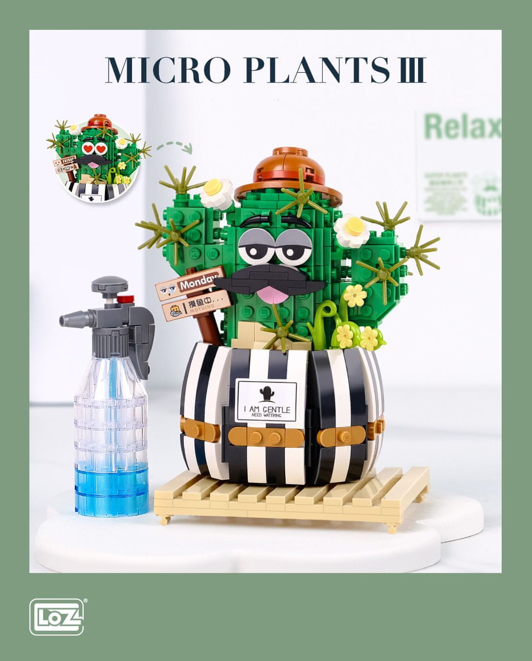 Uz Loz mini kocke možete sagraditi svoj slatki kaktus. Kaktus je odličan ukras za svaku sobu. Prednost mu je što ga ne treba zalijevati, iako u kompletu ima i raspršivač za vodu.