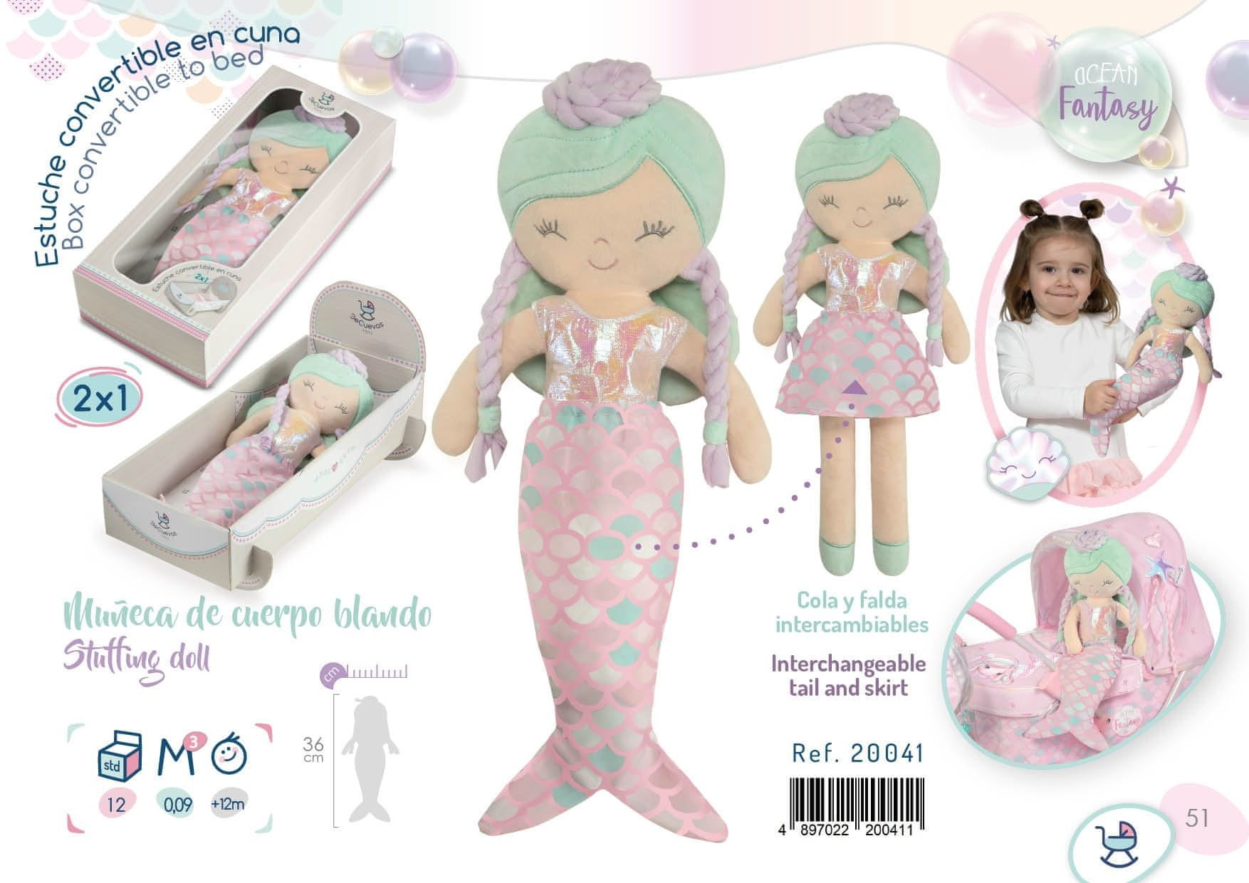Nježna ljepotica od glatkog plišanog materijala impresionirat će svaku djevojčicu – lutka prekrasnog imena Ocean Fantasy bit će šarmantan poklon za rođendane, praznike i druge prilike. Slatka lutka Ocean Fantasy ima rep poput sirene koji možete ukloniti, a sirena je odjednom dama u krilu. Lijepo se slaže s ostatkom Ocean Fantasy kolekcije za 2022. španjolske tvrtke DeCuevas.