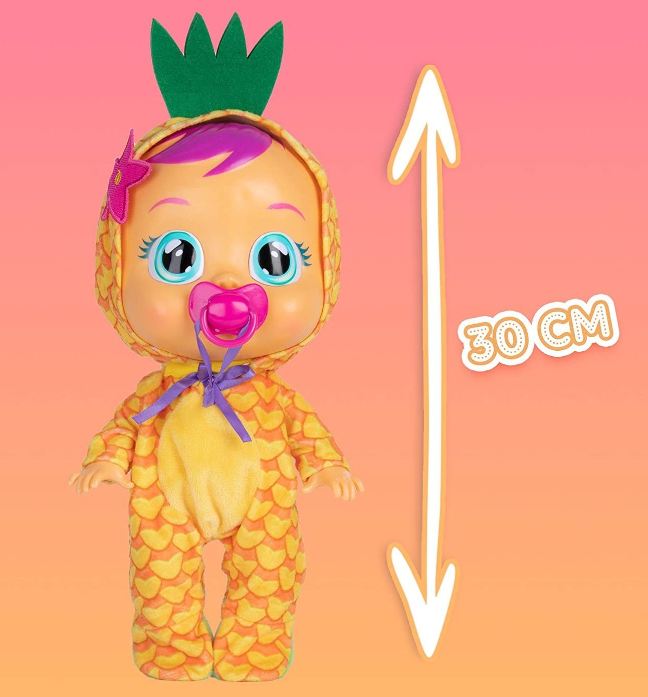 Otkrijte očaravajući svijet Cry Babies, interaktivnih lutki koje plaču koje trebaju brigu i ljubav svake djevojke! Lutka Pia u prekrasnoj mirisnoj odjeći s nadahnućem za ananas. Lutka Tutti Frutti roni prave suze i odaje autentične zvukove uplakane bebe. Duda i zagrljaj lijek su za njezine suze.