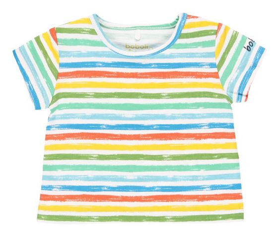 Vesela prugasta majica za dječake marke Boboli. Majica je vrlo udobna i ugodna za nošenje, izrađena je od 100% pamuka i pričvršćuje se na ramenima radi lakšeg odijevanja.