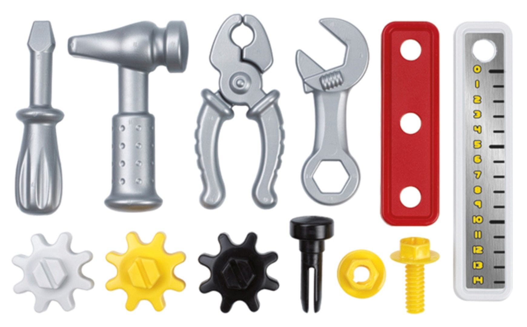 Ecoiffier radionica, s velikom radnom površinom, uključuje sav alat potreban mladom majstoru: kliješta, čekić, odvijač, vijke i matice.