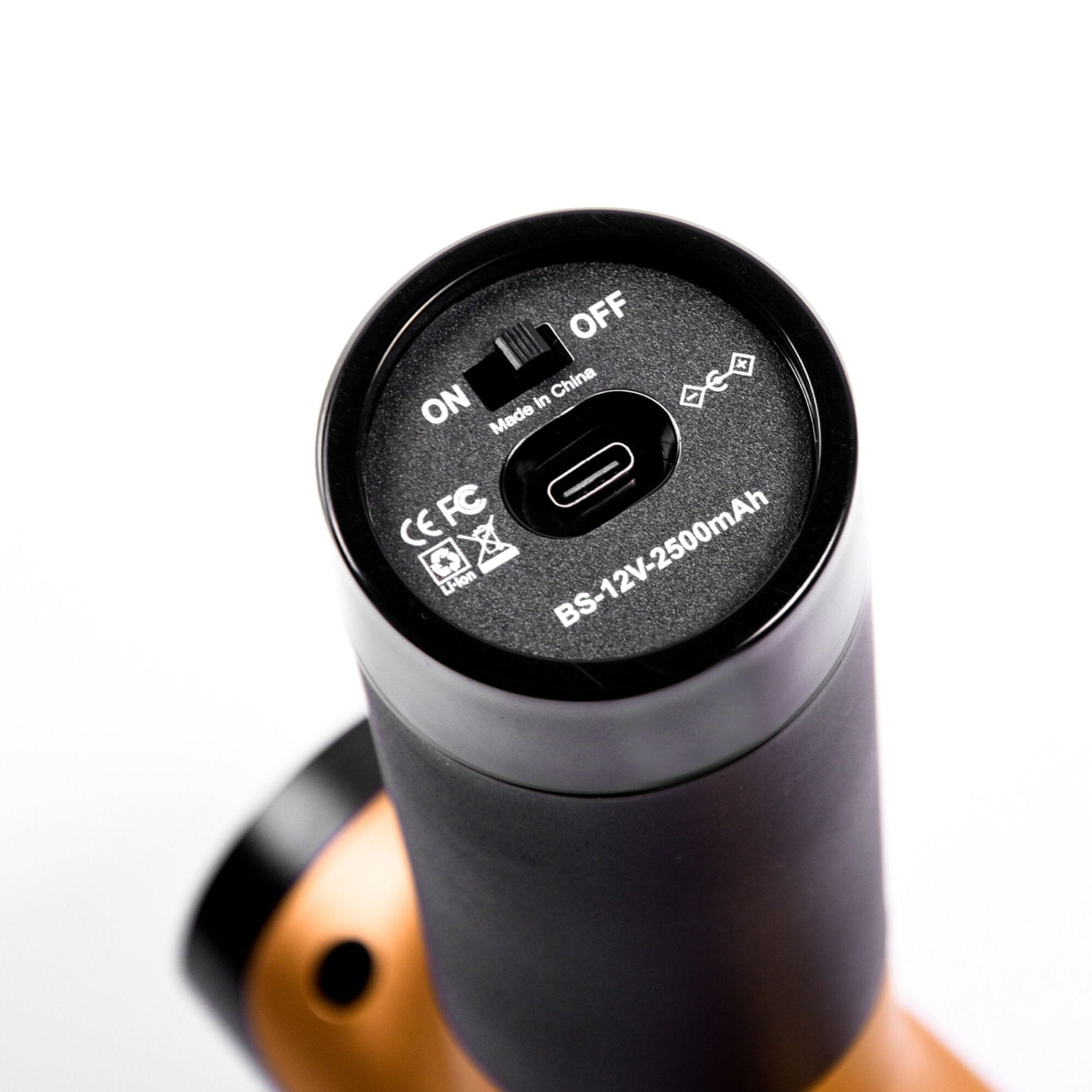 Masažni pištolj ima ugrađenu litij-ionsku bateriju kapaciteta 2500mAh, koja traje do 3 sata s jednim punjenjem, ovisno o korištenom stupnju brzine.