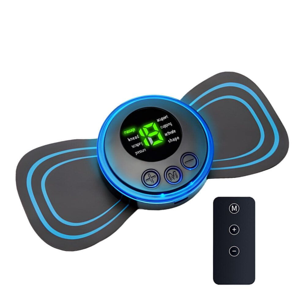 Masažni elektrostimulator – 8 načina rada, 19 stupnjeva intenziteta, USB punjenje, daljinski upravljač, zaslon prikazuje način rada i razinu snage. Pogodan za vrat, trbuh, bedra, ruke i druge dijelove tijela.