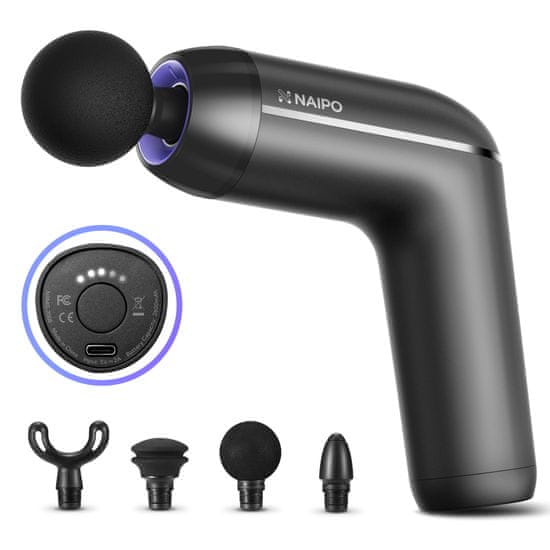 Masažni pištolj NAIPO (NPMG-2008) za korištenje po cijelom tijelu za opuštanje, posebno nakon napornog vježbanja. Nudi 5 razina intenziteta i 4 izmjenjive glave. Tihi rad i automatsko gašenje nakon 15 minuta su lijep bonus. Punjenje putem USB kabela uključenog u pakiranje.