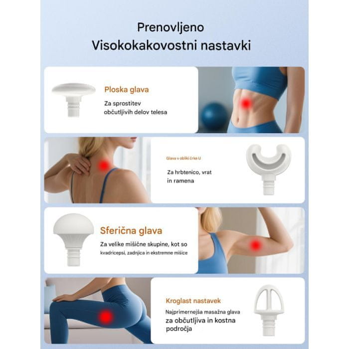 Prilagodljive masažne glave za različite dijelove tijela.