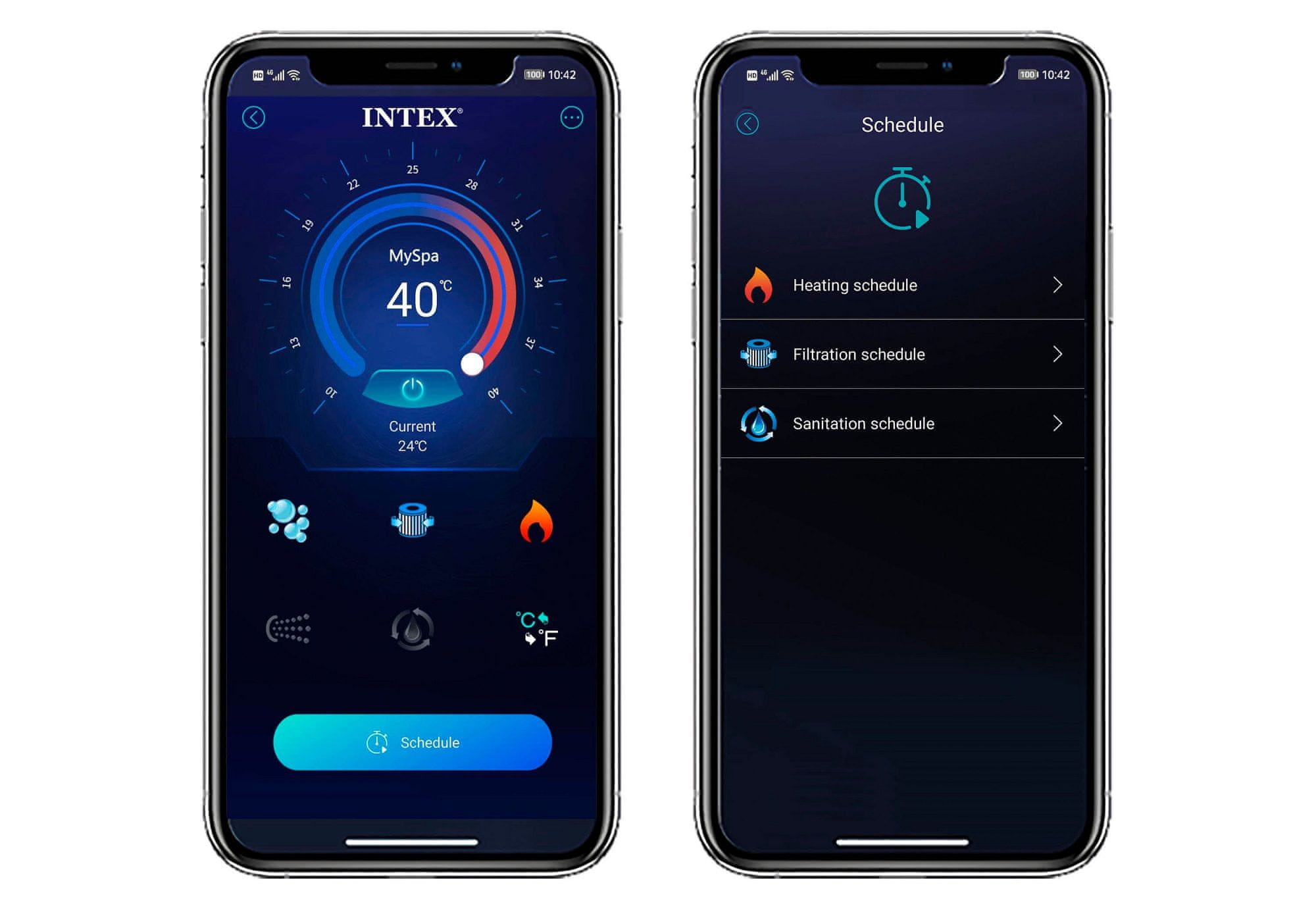 Masažni bazen Jet Bubble Deluxe, 2,18 × 0,71 m, marke Intex. Namijenjen je za 6 osobe. Volumen 1098 l. Uključuje 140 mlaznica za stvaranje mjehurića. Zagrijavanje za 1–2°C na sat. Digitalna upravljačka ploča s bežičnim punjenjem. Paket također uključuje 2 naslona za glavu i 2 patrona filtera.