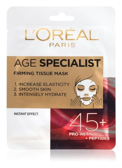 L'Oreal Paris Age Specialist 45+ maska u maramici za obnovu kože obogaćena je pro-retinolom, peptidom in hijaluronskom kiselinom. Maska povećava gipkost kože, intenzivno je vlaži, smanjuje bore, poboljšava njen tonus i jača je.