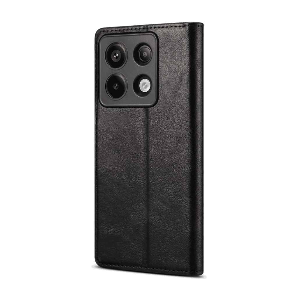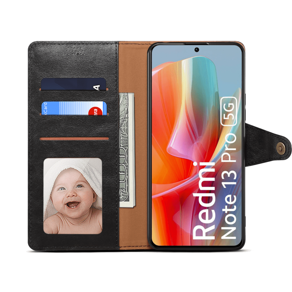 Usnjen klapovni ovitek za Redmi Note 13 Pro 5G crna – Zaštita šrečina pred praskama, Integrirano postolje, Reža za kreditnu kartu, Magnetno zapirana.