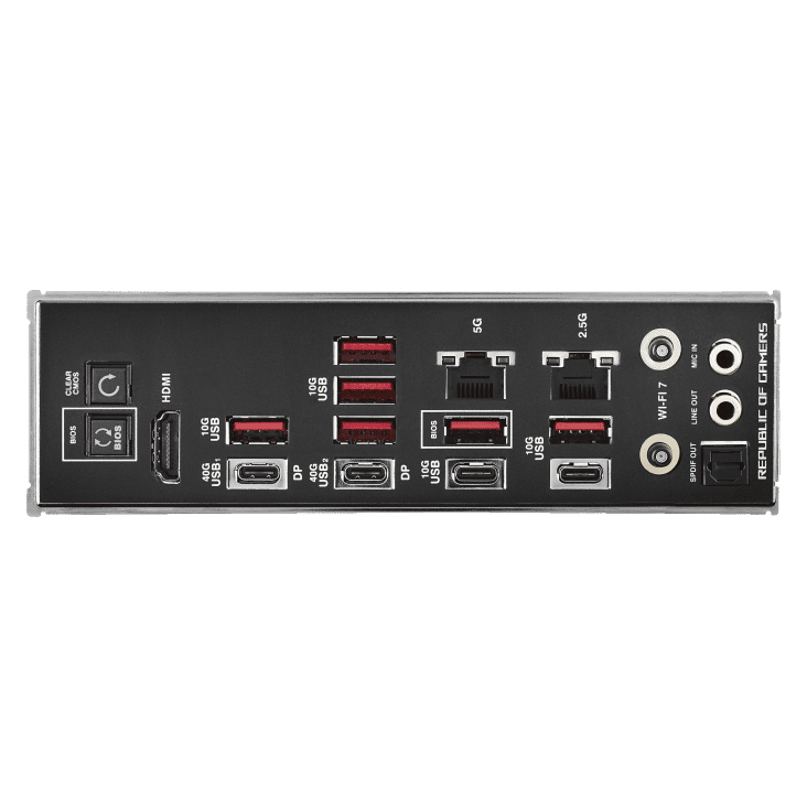 | I/O port (stražnji) | 2 x USB4® priključka (40 Gb/s) (2 x USB Type-C®) 8 x USB 10 Gb/s priključaka (6 x Type-A + 2 x USB Type-C®) 1 x HDMI™ priključak 1 x Wi-Fi modul 1 x Intel® 2,5 Gb Ethernet priključak 1 x Realtek 5Gb Ethernet 2 x pozlaćena audio konektora 1 x S/PDIF optički izlaz 1 x tipka BIOS FlashBack™ 1 x gumb za brisanje CMOS-a |