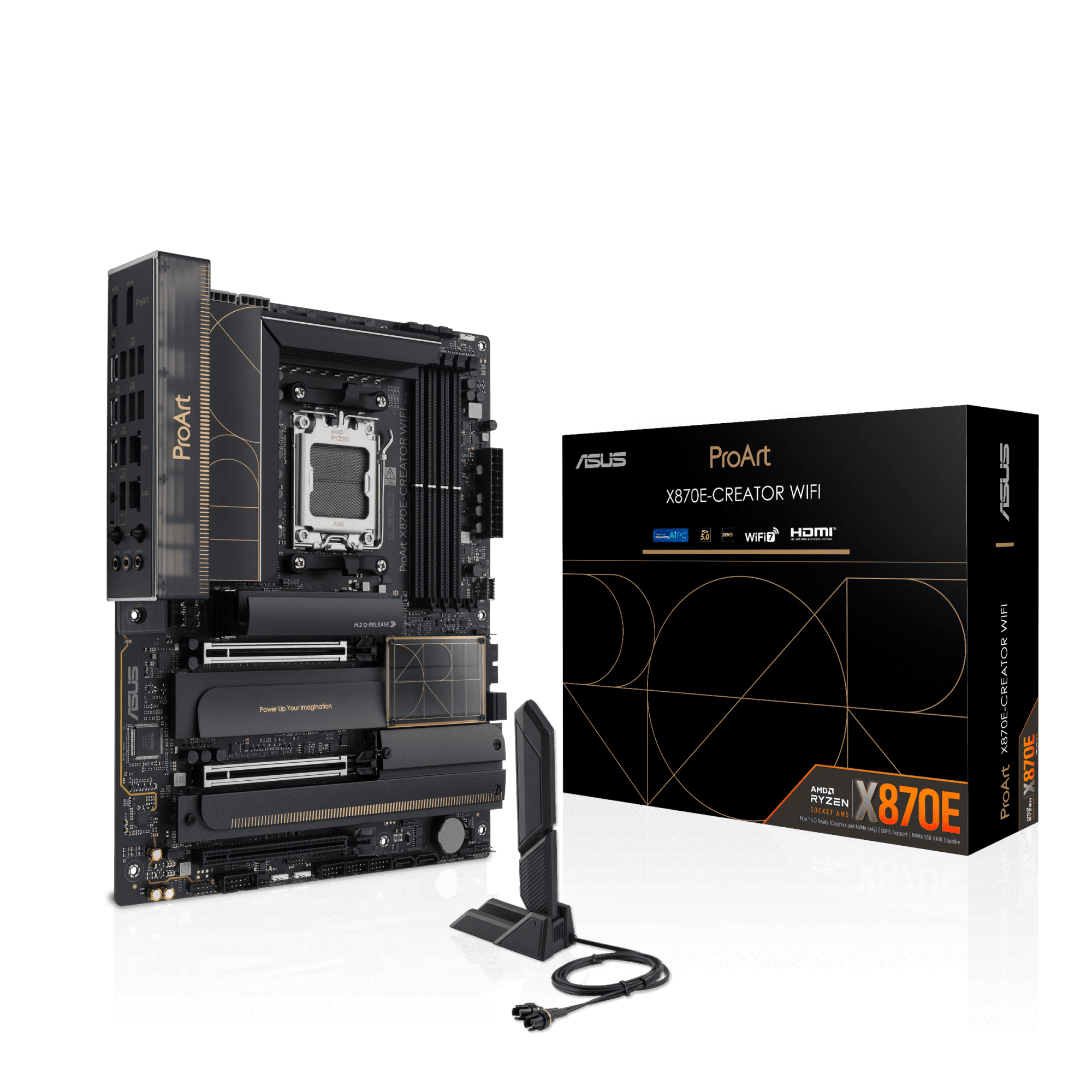 Asus ProArt X870E-Creator WiFi matična ploča pruža iznimne performanse i povezivost za kreatore s najnovijim procesorima serije AMD Ryzen™ 9000, 8000 i 7000 te pruža profesionalni stil s metalik zlatnim detaljima.