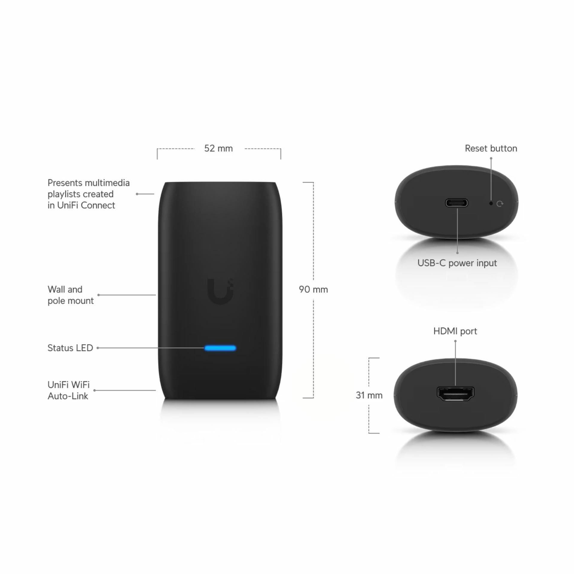 UniFi Display Cast Lite je kompaktni uređaj za digitalno oglašavanje, dizajniran za reprodukciju medijskih sadržaja na HDMI zaslonima. Podržava rezoluciju do 1080p i omogućuje automatsko uključivanje/isključivanje putem HDMI CEC-a. Napaja se putem USB-C priključka i lako se povezuje s UniFi mrežom p