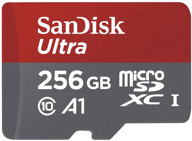 Snažna SanDisk Ultra micro SDXC kartica kapaciteta 256 GB koja nudi kapacitet čitanja do 150 MB/s. Uključen je SD adapter.