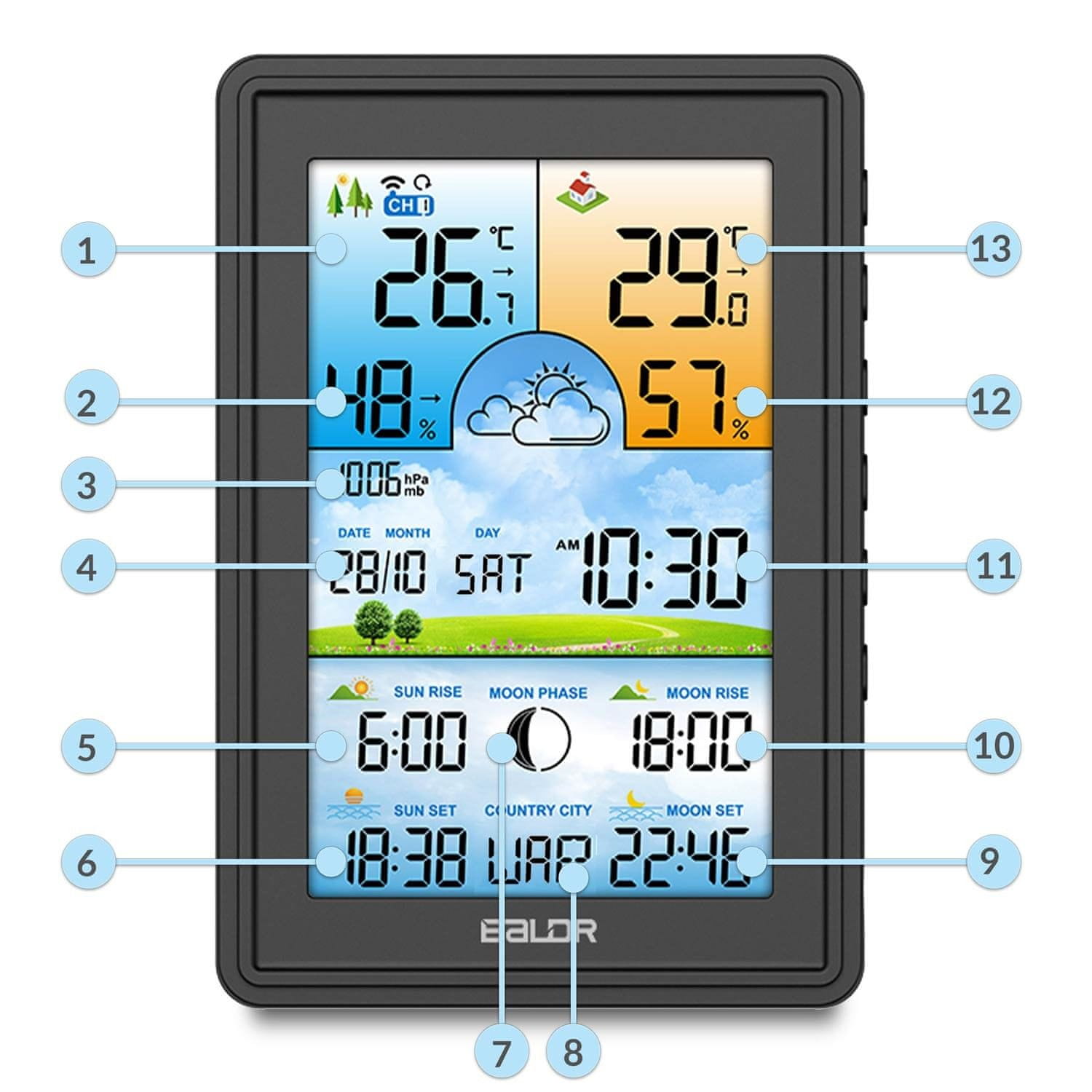 Također radi kao kalendar, sat i budilica. S ovim uređajem, informacije o vremenu i mjesečevim mijenama su vam na dohvat ruke!