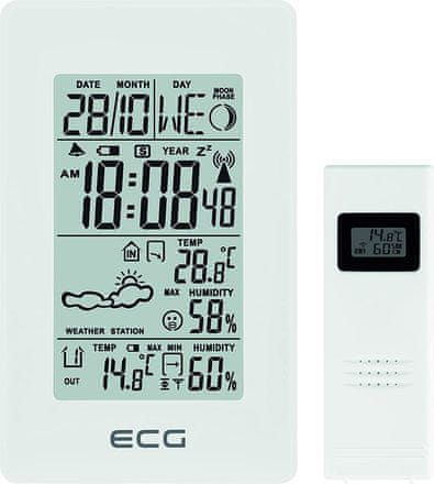 Osim uobičajenih podataka o temperaturi i vremenskih informacija, meteorološka stanica ECG MS 100 White funkcionira i kao sat (prikazuje sate, minute, sekunde), budilica ili kalendar. U slučaju sata, možete postaviti 12-satni ili 24-satni format prema svojim željama. Također možete koristiti budilicu, gdje meteorološka stanica također ima funkciju odgode alarma od 5 minuta. Zaslon također prikazuje datum. Bonus je prikaz mjesečeve mijene.