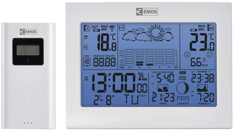 Bežična vremenska stanica E8835, marke Emos, može mjeriti unutarnje i vanjske temperature i mnoge druge vrijednosti, poput vlage i tlaka. Temperaturni raspon od –20 °C do +60 °C. Termometar je opremljen oznakom trenda razvojem temperature i tlaka. Pogledajte izlazak / zalazak sunca i vrijeme mjeseca. Mogućnost povezivanja do 3 senzora.