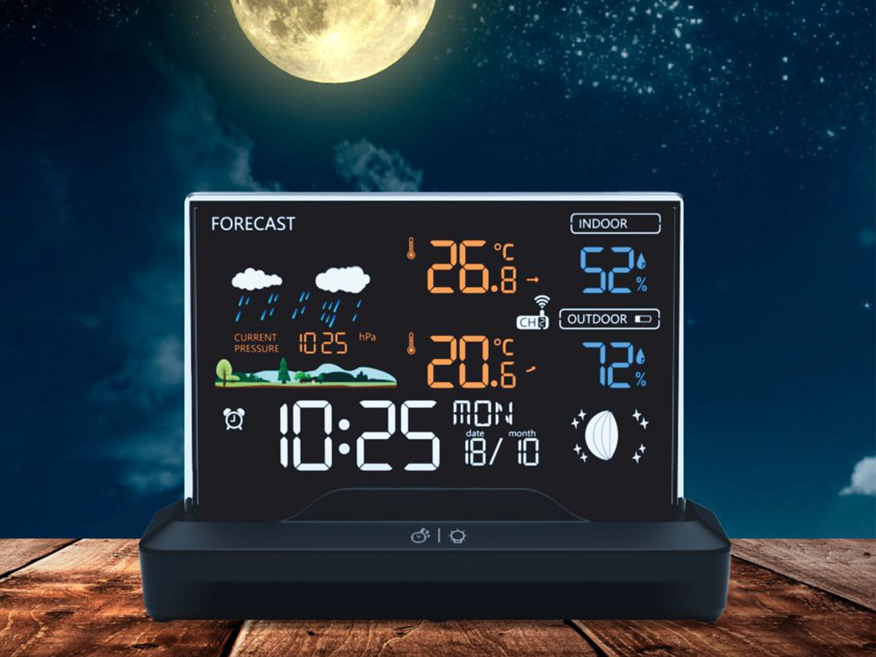 Meteorološka stanica nudi i informacije o mjesečevim mijenama. Pomoću ove funkcije možete jednostavno pratiti mjesečeve mijene. Komplet također uključuje 1 bežični senzor, koji se može postaviti vani ili unutra i mjerit će podatke, koje će zatim prikazati meteorološka stanica.