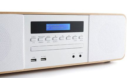 Mikro sustav drvo/bijela s Bluetoothom s induktivnim punjenjem, FM radio s RDS-om reproducira CD-R/RW/MP3, snaga 50 W, ekvilajzer, USB ulaz za reprodukciju i USB priključak za punjenje, daljinski upravljač, napajanje iz 230V mreže.