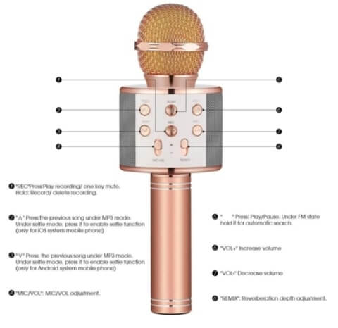 - Jednostavan za upotrebu – Ovaj Bluetooth mikrofon uopće nije kompliciran za upotrebu. Postoji samo nekoliko jednostavnih gumba kao što su klizni gumb za glasnoću mikrofona i remix, +/- gumb za glasnoću zvučnika i prebacivanje pjesama itd. Jednom kad se povežete sa svojim uređajem (ili microSD karticom), vrijeme je za zabavu!