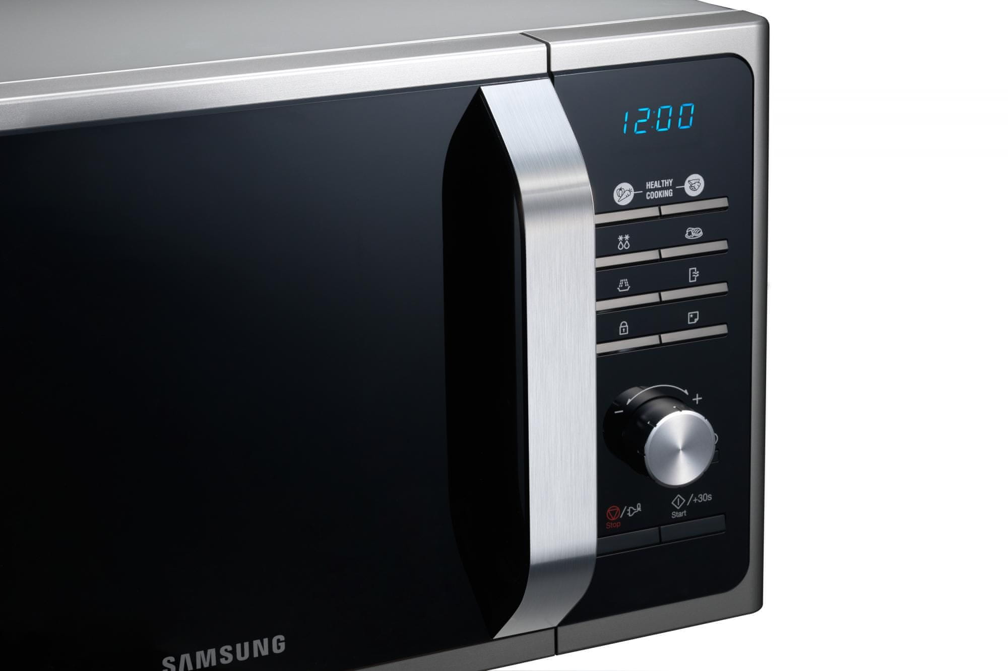 Poboljšajte izgled vaše kuhinjePoboljšajte svoju kuhinju stiliziranom mikrovalnom pećnicom Samsung F300G s prednjim dijelom od crnog stakla okruženog vanjskim prostorom s tankim uzorkom, podesivom ručkom i kristalno plavim zaslonom i srebrnim gumbima. |