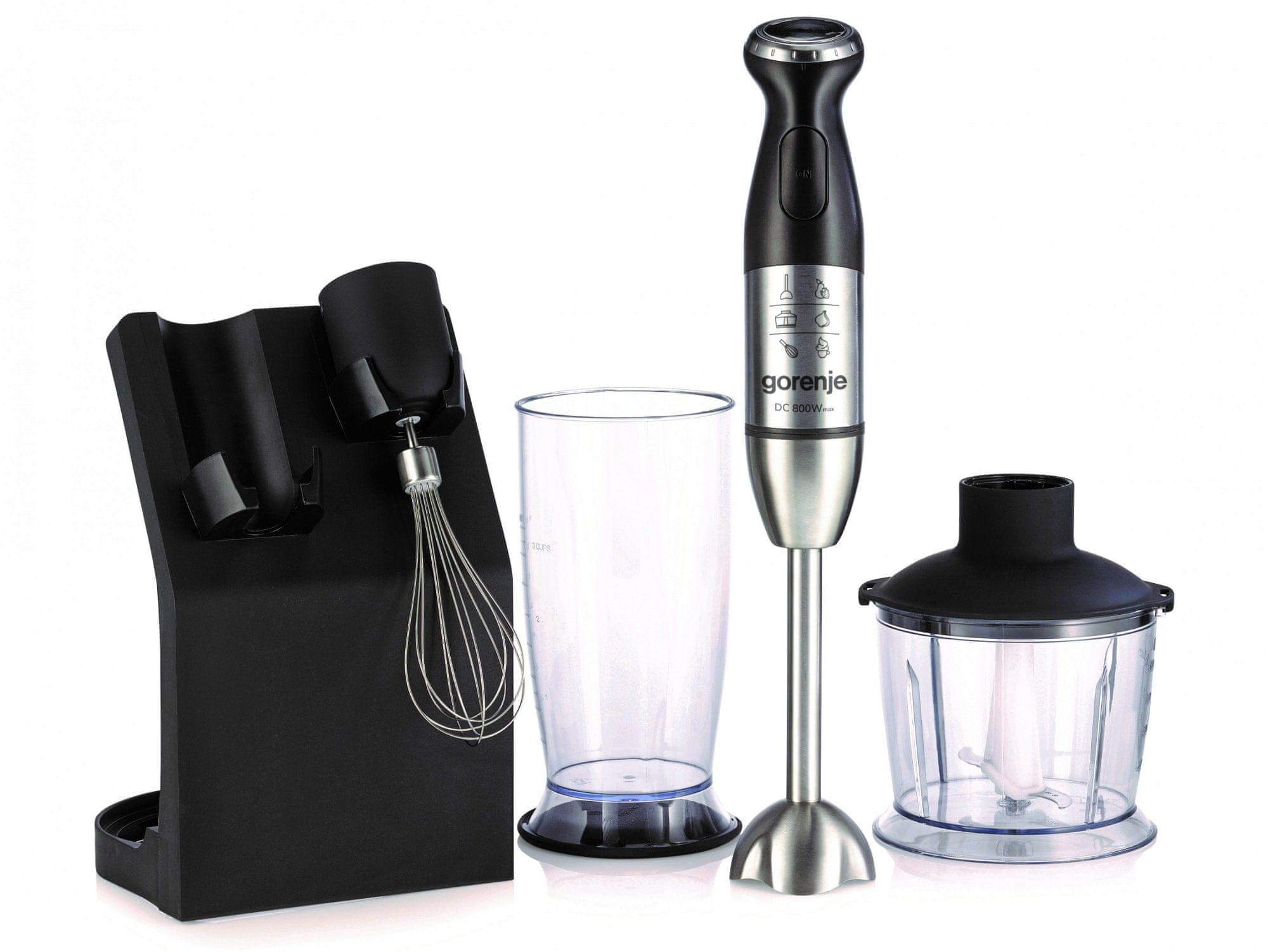 Štapni mikser od 500 W. Gorenje HBC564QW nudi 2 brzine, uklonjivi dodatak za miješanje od nehrđajućeg čelika, posudu za sjeckanje od 0,5 litre, pjenjač i posudu za miješanje od 0,5 litre.