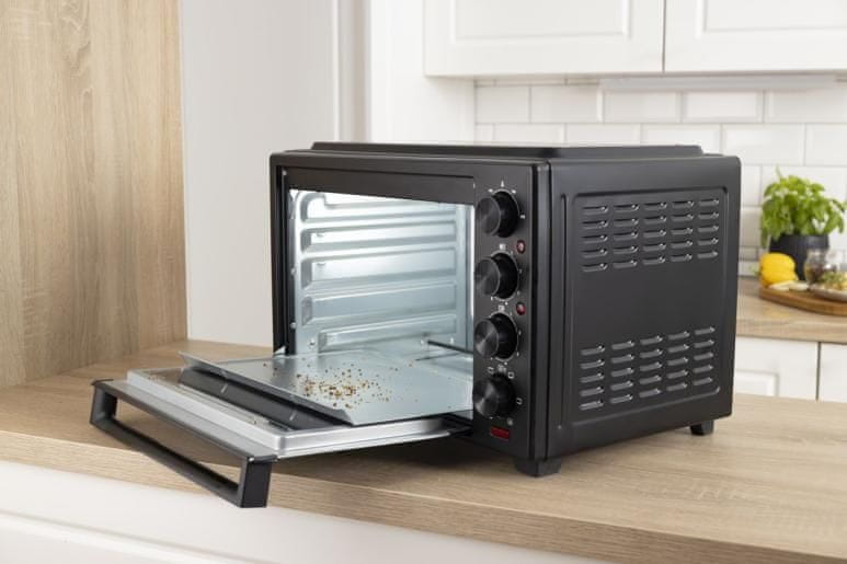 Uz izdašni kapacitet od 38 litara i četiri razine pečenja možete pripremati više jela istovremeno, što je idealno za obiteljske ručkove. Konvekcijska tehnologija s ugrađenim ventilatorom osigurava ravnomjerno kruženje vrućeg zraka kroz unutrašnjost, pa će hrana uvijek biti hrskava izvana, a sočna iznutra. Integrirani senzor omogućuje vam precizno podešavanje temperature od 100 °C do 230 °C, dok intuitivni okretni gumbi pružaju potpunu kontrolu nad svim funkcijama.