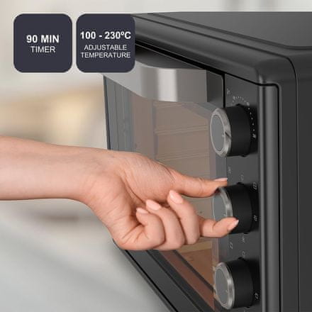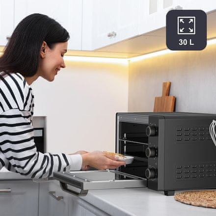 Značajke: – volumen: 30 l – tajmer: 90 minuta – izuzetno velika staklena vrata – odličan pogled u pećnicu – zvučno upozorenje – birač temperature: od 100°C do 230°C – funkcija „STAY ON“: način.