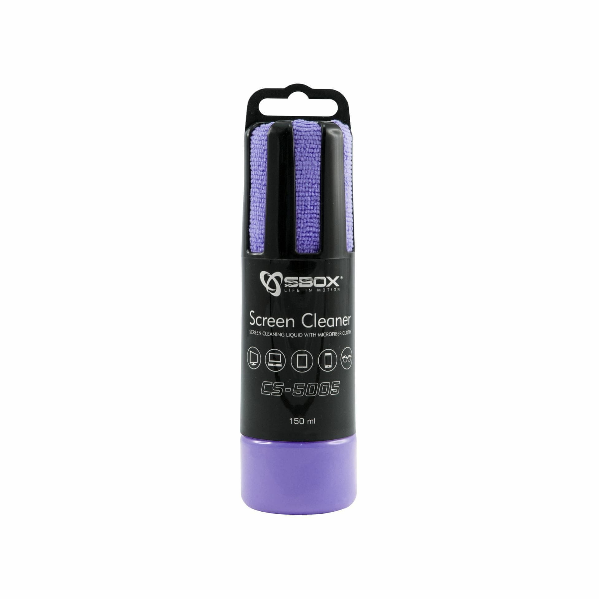 SBOX čistač CS-5005 je pogodan za ekrane na TV-u, LCD-u, računalima, prijenosnim računalima, fotoaparatima, mobitelima, tabletama, priložena krpa od mikrofibre, ljubičasta.