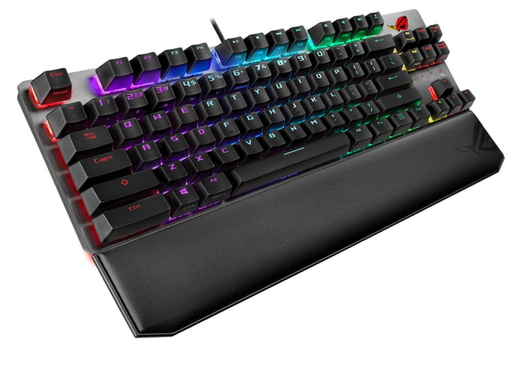 Tipkovnica je uključena s mekim ergonomskim magnetskim naslonom za ručni zglob za dodatnu udobnost tijekom korištenja. Tipke su pojedinačno osvijetljene Aura Sync osvjetljenjem, a ROG logo i donji dio tipkovnice također su osvijetljeni za pravi ugođaj. Tipkovnica nudi izbor između različitih svjetlosnih efekata i boja. Dodatno, ima posebnu tipku za zaključavanje Windows tipki koja sprječava smetnje tijekom igre i posebnu tipku za privatnost koja odmah skriva sve aplikacije i isključuje zvuk kada se pritisne. Aluminijska gornja ploča osigurava dobru izdržljivost i dugotrajnu upotrebu.
