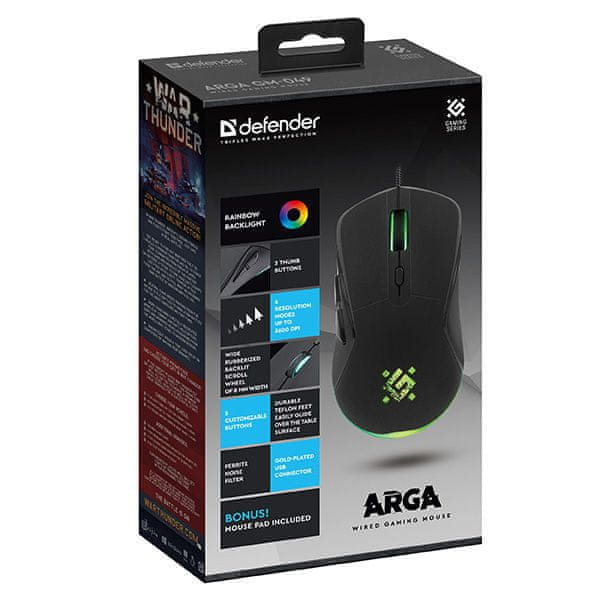 Defender Arga GM-049 je pristupačan gaming miš dizajniran za igrače koji žele preciznu kontrolu i atraktivan izgled. Opremljen je RGB rasvjetom u duginim bojama , što mišu daje prepoznatljiv gaming izgled.