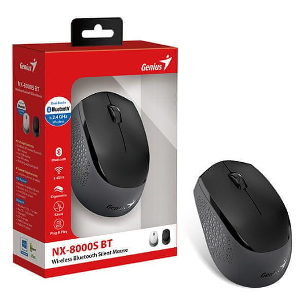 Genius NX-8000S BT je moderni bežični miš koji kombinira udobnost, tihi rad i fleksibilnu povezivost. Podržava dvostruku vezu , što znači da se može povezati putem Bluetootha ili putem 2,4 GHz USB nano prijemnika. To znači da ga možete koristiti s računalima, prijenosnim računalima, tabletima ili telefonima i brzo prebacivati između do tri uređaja .