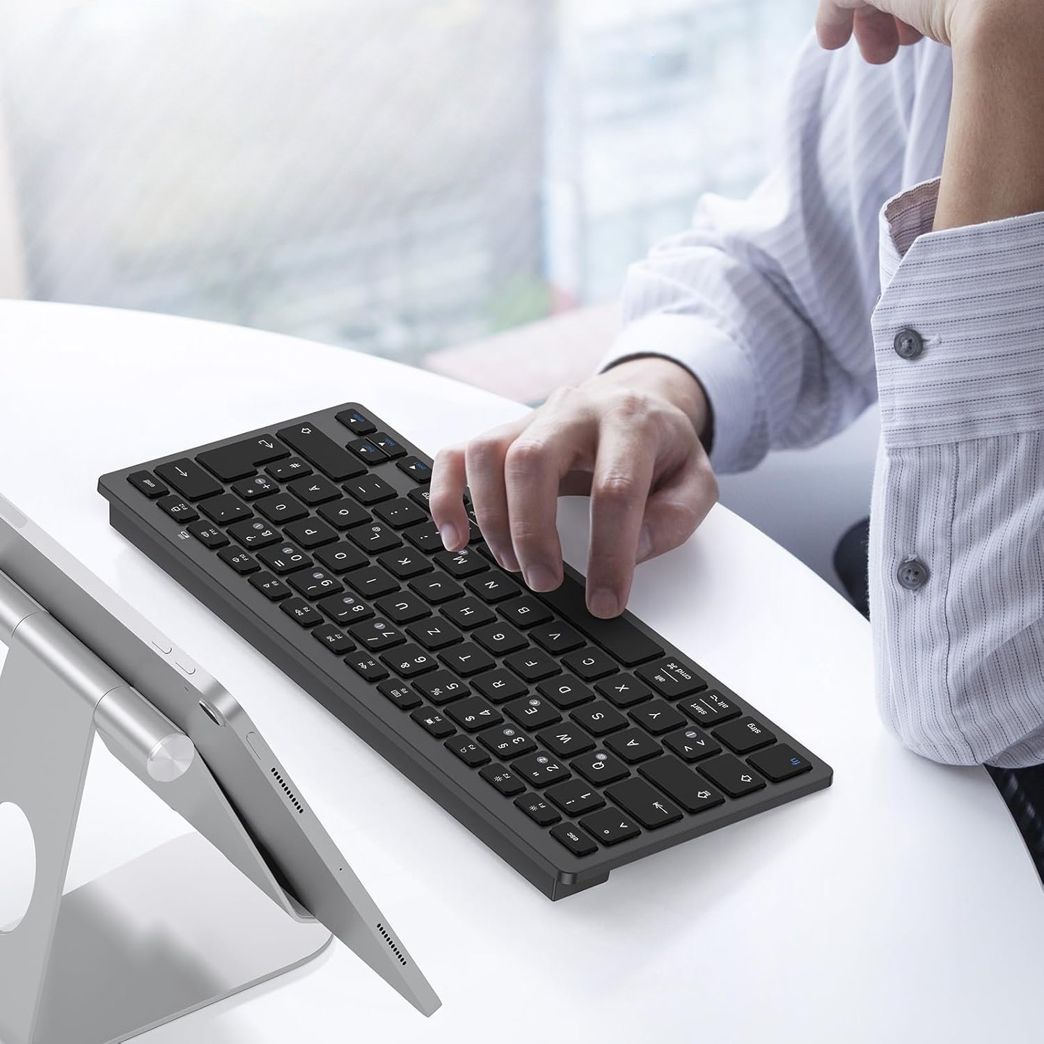 Emetok Bluetooth QWERTZ tipkovnica je rješenje za korisnike koji cijene mobilnost, udobnost i funkcionalnost. Zahvaljujući kompaktnom dizajnu i laganom kućištu, ovaj je uređaj prikladan za putovanja, rad na daljinu i svakodnevnu upotrebu. Kompatibilna s većinom tableta, pametnih telefona i Apple uređaja, tipkovnica osigurava brzu i stabilnu bežičnu vezu putem Bluetooth 5.1 tehnologije. Precizno dizajnirane škaraste tipke omogućuju udobno i tiho tipkanje, a ergonomski QWERTZ raspored olakšava rad na njemačkom jeziku. Dodatne funkcijske tipke omogućuju kontrolu svjetline zaslona, zaključavanja, pretraživanja i reprodukcije glazbe – sve s tipkovnice. Uključene su dvije AAA baterije, što omogućuje trenutačni početak rada bez potrebe za punjenjem. Zbog svog ravnog profila (debljine samo 0,6 cm), tipkovnica je laka za nošenje i stane u svaku torbu. Ovo je prikladan izbor za studente, profesionalce i sve koji trebaju pouzdan alat za tipkanje bilo gdje. Njen moderan dizajn u crnoj boji dodaje eleganciju, a izdržljiva konstrukcija osigurava dug vijek trajanja.