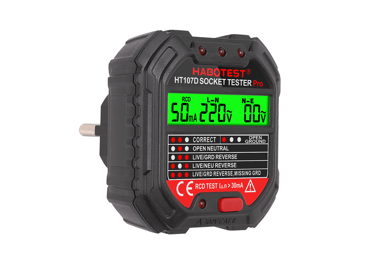 Tester je opremljen svijetlim digitalnim zaslonom pomoću kojeg možete lako očitati rezultate mjerenja. LED indikator koji se nalazi na vrhu uređaja obavijestit će vas o svim problemima. Ako tester otkrije bilo kakvu abnormalnost, LED diode će se upaliti u određenoj kombinaciji. Na taj način ćete brzo saznati, na primjer, o ispravnom spoju, nedostatku uzemljenja, faznom vodiču itd. S HT107D također možete izvršiti jednostavan RCD test, samo pritiskom na odgovarajuću tipku.