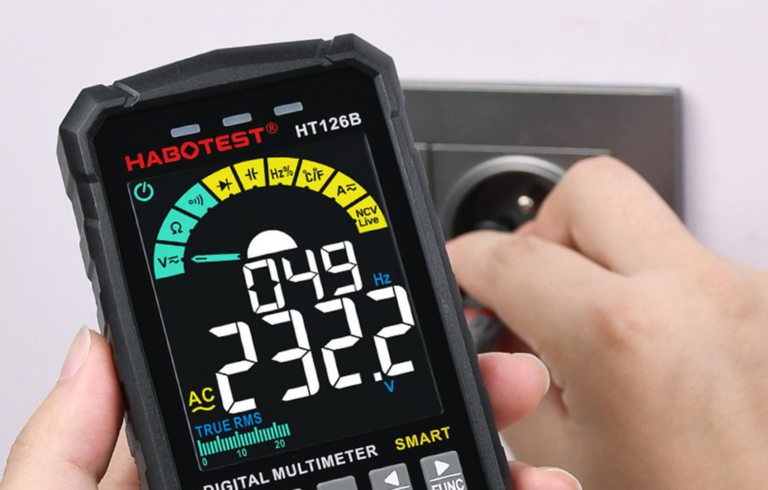 HT126B je pametan i robustan multimetar tvrtke Habotest. Budući da ga karakteriziraju precizne mjere, može se koristiti i na otvorenom. Opremljen velikim zaslonom u boji i silikonskim gumbima – korištenje je jednostavno i ugodno. Kompaktan i lagan – ima i LED svjetiljku koja omogućuje rad iu mračnim prostorijama. Za rad su potrebne 4 AAA baterije od 1,5 V (nisu uključene). Možete ga koristiti za mjerenje napona, otpora, kapaciteta itd.