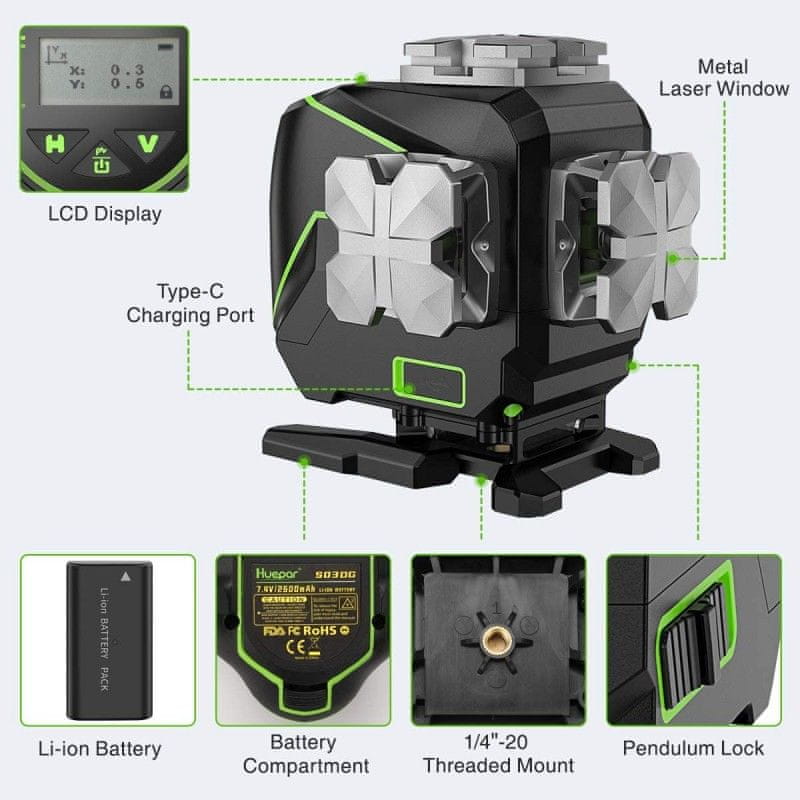 Huepar PRO12 line konstrukcija laserska razina Bluetooth + daljinski upravljač S03DG