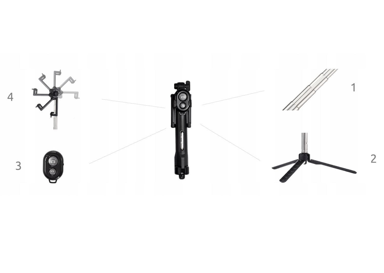 - 3 u 1 – set uključuje monopod koji se može odvojiti na stalak (kao stalak) i daljinski upravljač. Promjena načina je jednostavna i zahtijeva samo nekoliko poteza. Izvucite ručku daljinskog upravljača, ispružite noge i zaključajte glavu. Podešavanje kuta nagiba u rasponu od 280 stupnjeva dat će vam najbolji okvir. Monopod se proteže na duljinu od 65 cm.