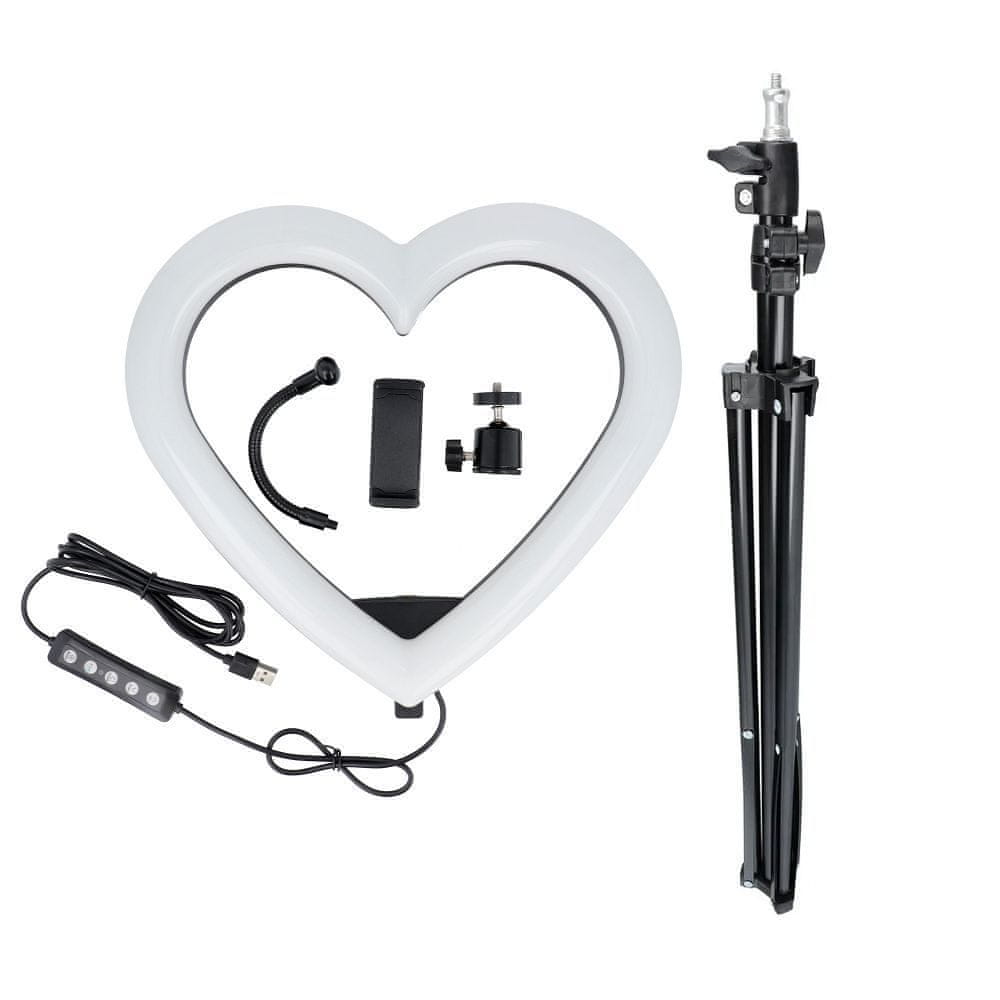 LED lampa u obliku srca s držačem za telefon i stativom. Kružno LED svjetlo predstavlja profesionalnu rasvjetu zahvaljujući kojoj možete napraviti savršene portrete ili video snimke. Vaše fotografije i videozapisi mogu izgledati profesionalno bez obzira koliko svjetla ulazi u prostoriju izvana. Svjetiljka je opremljena kontrolnom pločom na kabelu. Omogućuje širok raspon promjena boje osvjetljenja u RGB načinu rada.