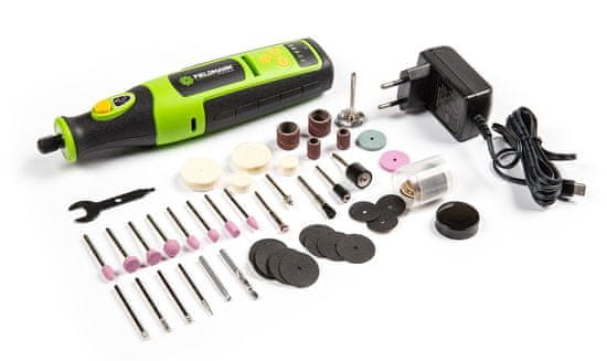 Akumulatorska brusilica FDMB 200170-A marke Fieldmann. Baterija Li-Ion 7,2 V / 1,2 Ah. Brzina bez opterećenja 5.000 – 25.000/min. Ergonomska ručka. Mini brusilica. Ukupno 70 dodataka. Punjač, praktična plastična kutija.