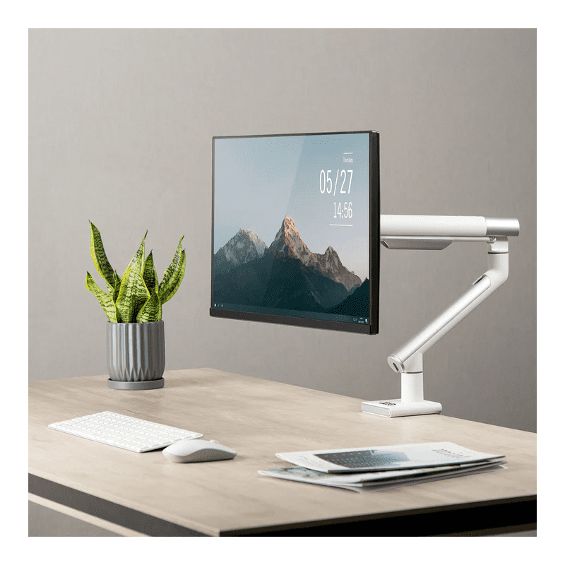 Premium nosač za monitore s plinskom oprugom ErgoOffice ER-437. Nosač je dizajniran za monitore veličine od 17″ do 32″ s maksimalnom težinom od 9 kg. Ruka je izrađena od visokokvalitetnih materijala – opremljena je izdržljivom montažnom kopčom koja omogućuje montažu na stol ili drugu ravnu površinu.