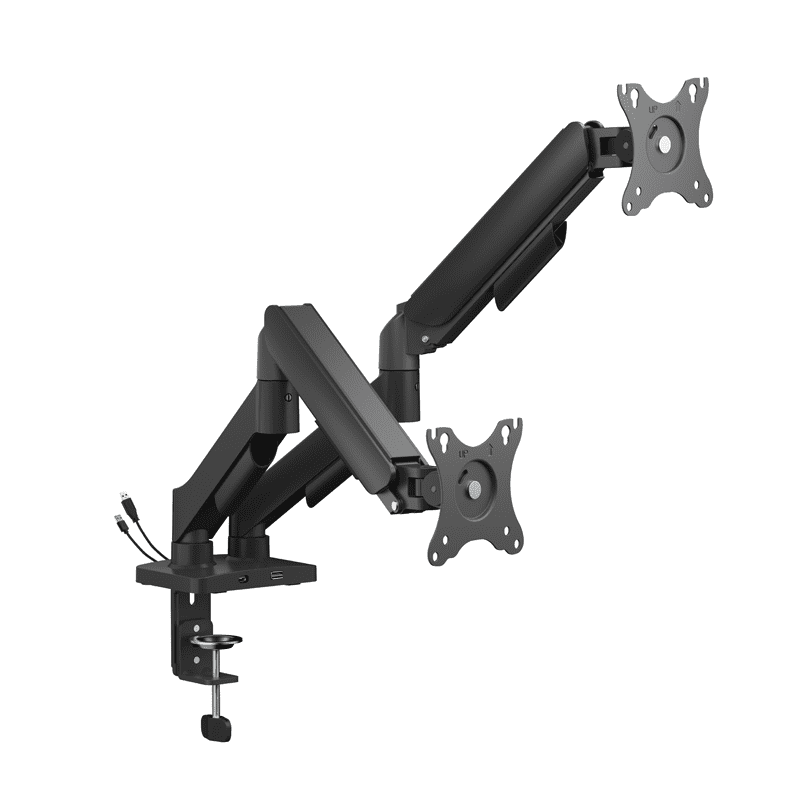 Stolni nosač za monitor Gembird MA-DA2U-01 s integriranim USB priključcima. Držači se okreću, izvlače i spuštaju, naginju za promjenu kutova gledanja i omogućuju okretanje zaslona iz vodoravnog u uspravni položaj itd.