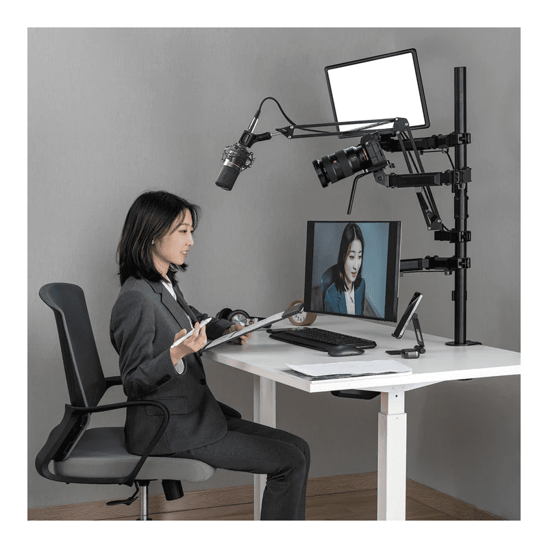 Sve-u-jednom studijsko profesionalno višenamjensko postolje NanoRS s nosačem za monitor, mikrofon, kameru i reflektor. Postolje vam omogućuje da na stol pričvrstite svu potrebnu opremu za snimanje ili streaming, štedi prostor na vašem stolu i nudi izvrsne mogućnosti postavljanja. Zahvaljujući int