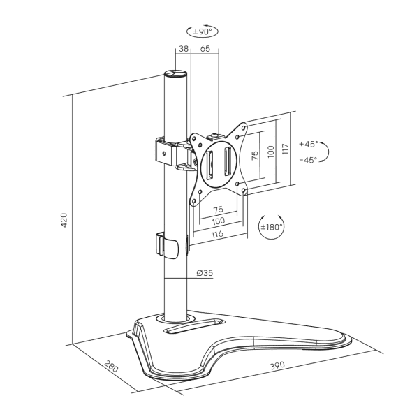 Zahvaljujući širokom rasponu nagiba (+45° do –45°), mogućnosti okretanja u obje strane do ±90° i rotacije zaslona do ±180°, lako ćete pronaći idealan kut gledanja. Odvojiva VESA ploča osigurava brzu i jednostavnu instalaciju, dok organizator kabela održava vaš radni prostor urednim i preglednim.